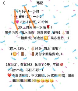 【服务项目】:服务内容(清水油香,浪漫唇柔,6与9 滑 十指柔情,海底捞月,果冻丝竹,